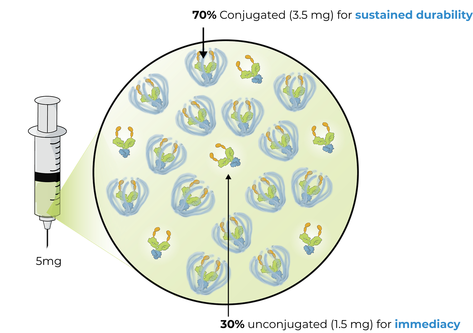 The enhanced formulation of KSI-501 includes unconjugated and conjugated protein. The unconjugated protein is designed to deliver a strong “pulse” and the conjugated protein is designed to persist in the eye to provide sustained disease control.